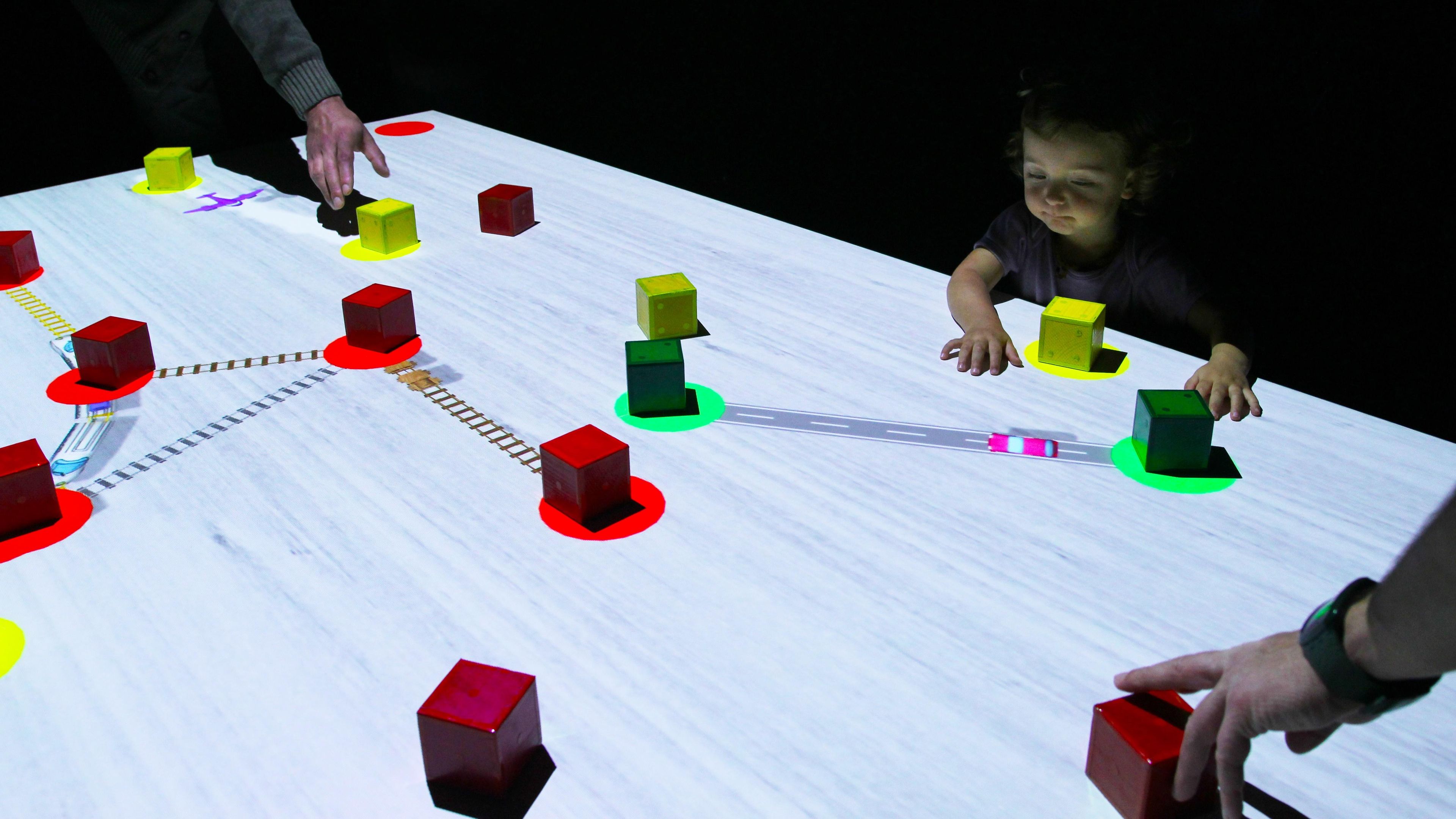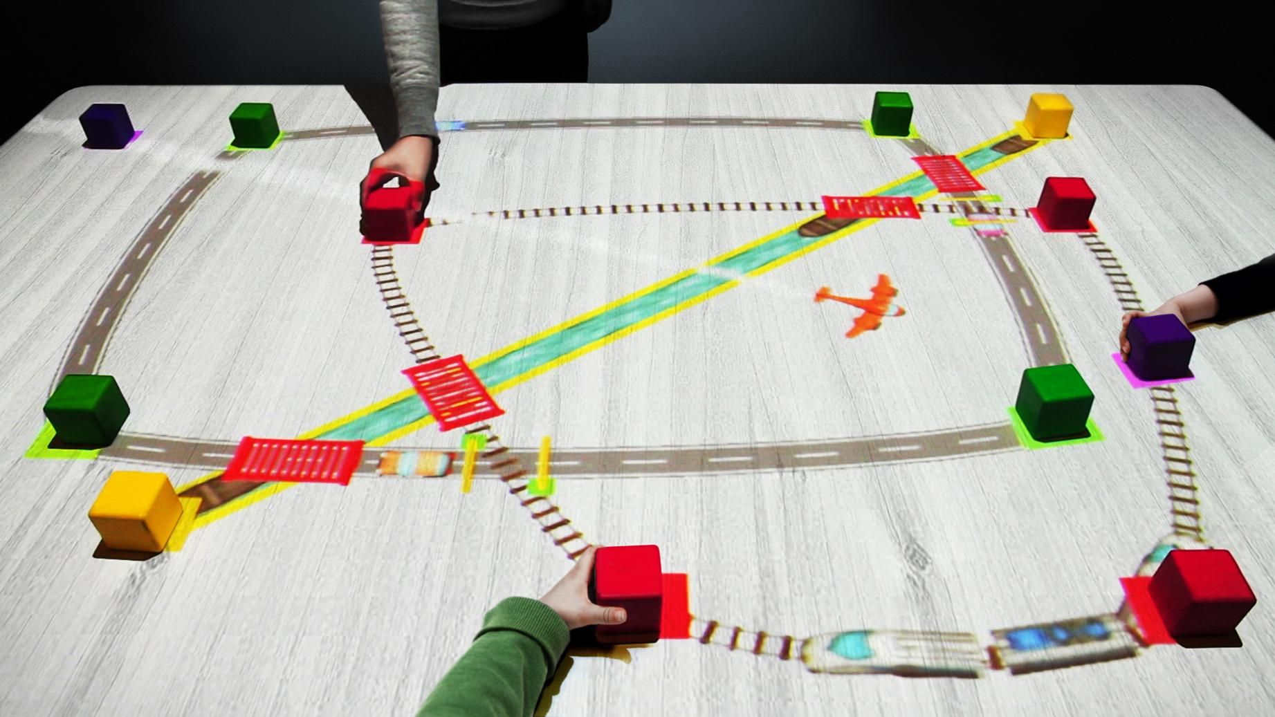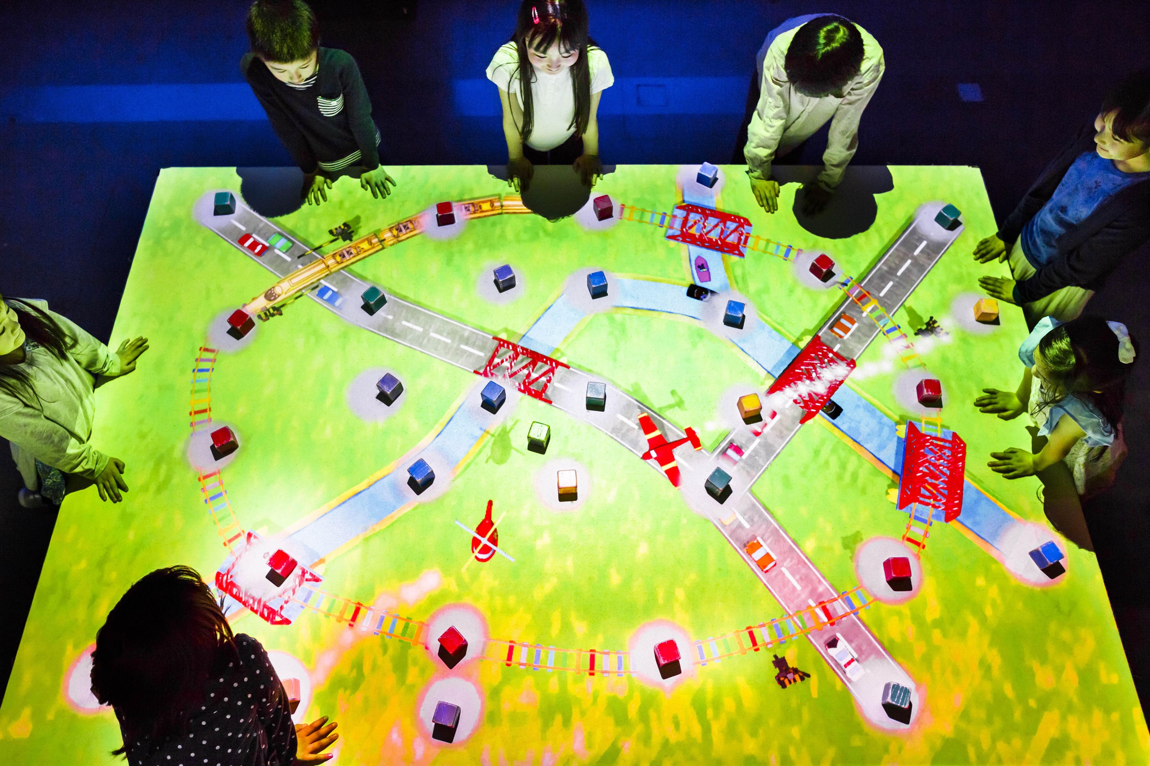 In Connecting! Train Block, cars and trains run along roads and railroad tracks that are connected by wooden blocks. As children place different blocks on the table, more cars and trains appear, forming a townscape. Children play by placing the blocks in different positions to create a town collaboratively with other children.