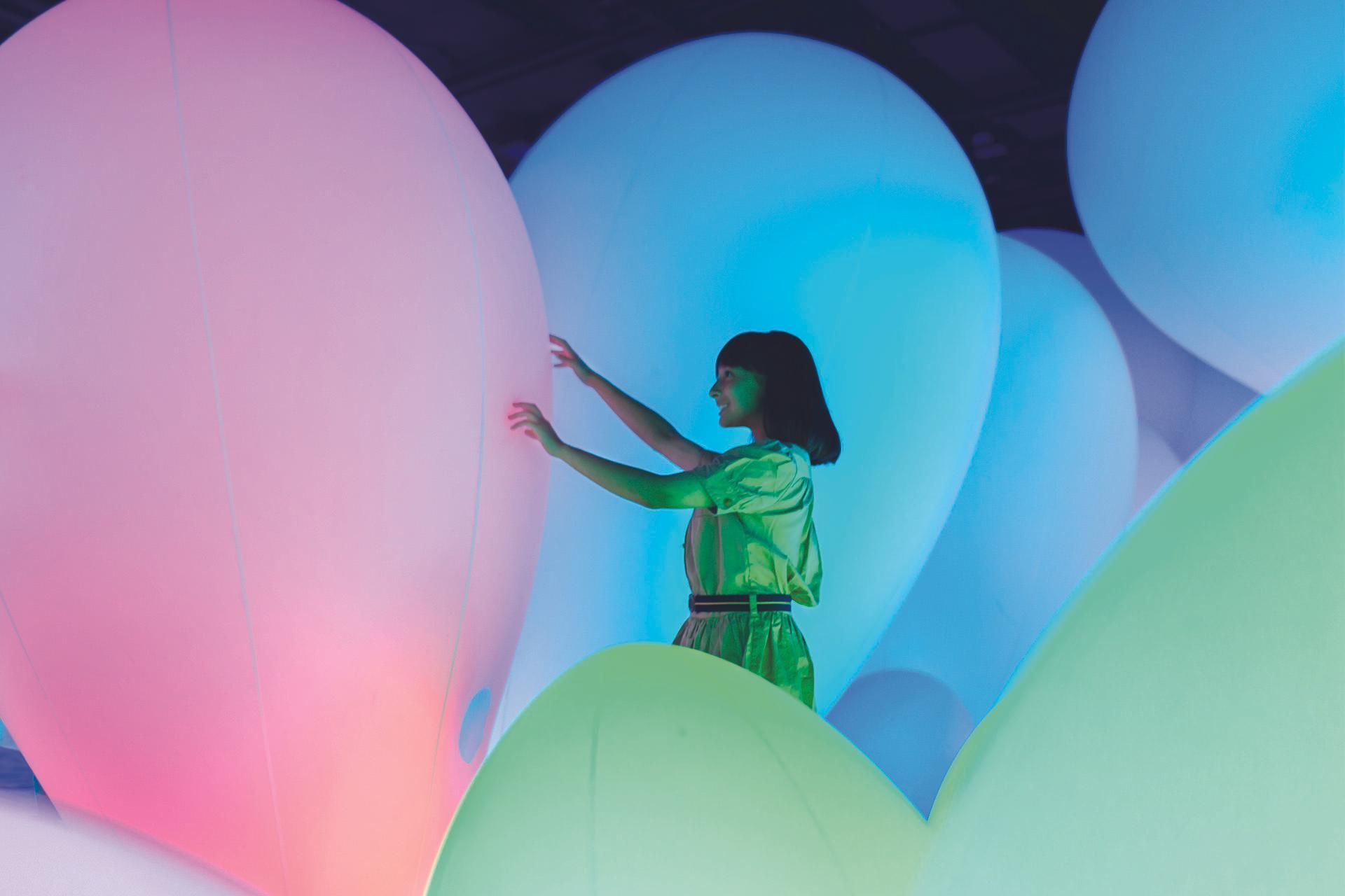 Light objects floating in the air are affected by surrounding floating objects. The sound tone and color of the light resonates through the surrounding objects, changing the color of the entire space.