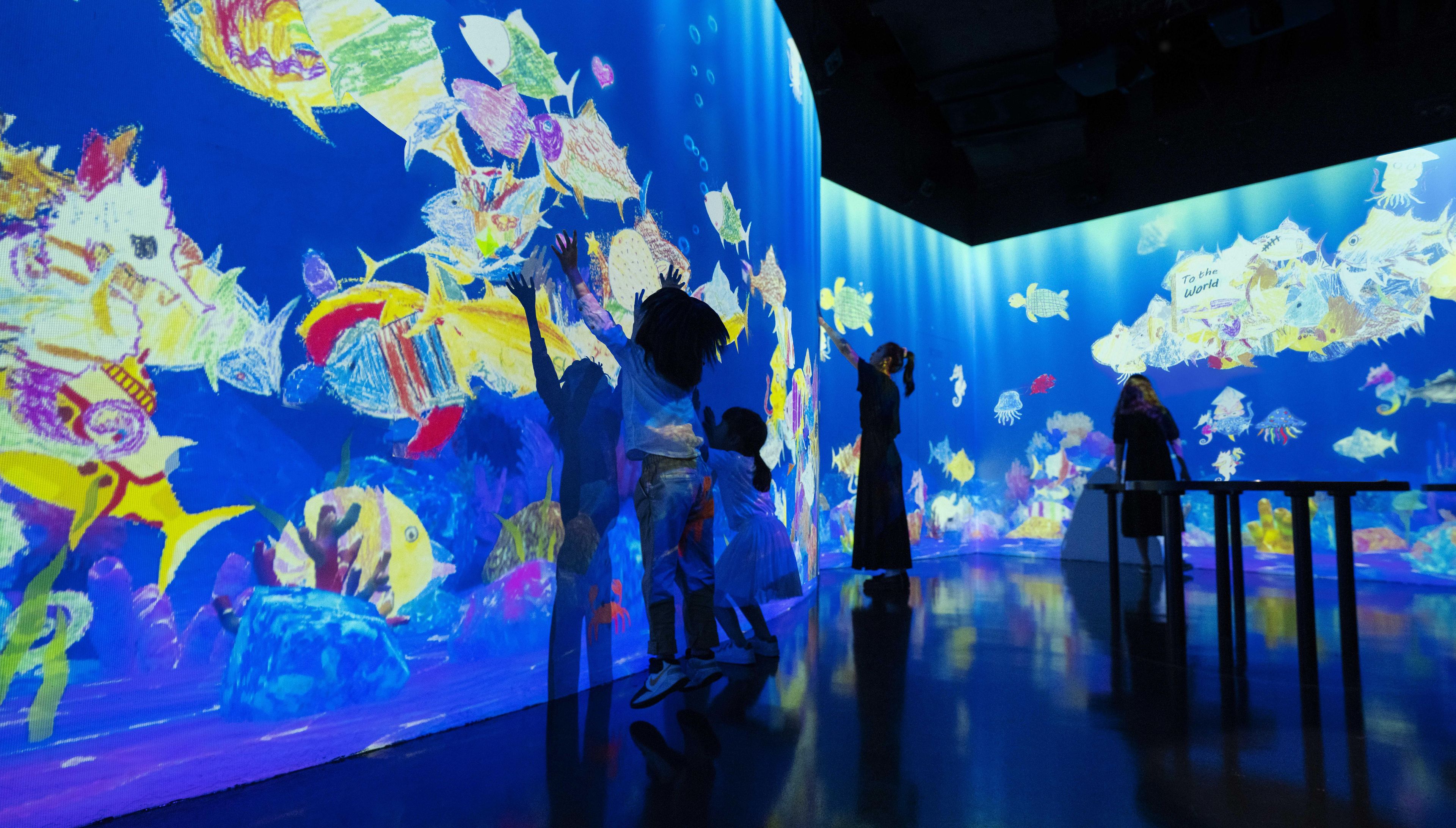 All the various fish drawn by everyone swim around in this ocean.