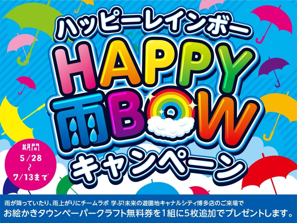 雨を気にせず店内でゆっくり楽しい一日を過ごしませんか?雨が降っていたり、雨上がりに、「チームラボ 学ぶ!未来の遊園地キャナルシティ博多店」にご来場いただきますと、お絵かきタウンのペーパークラフト無料券...