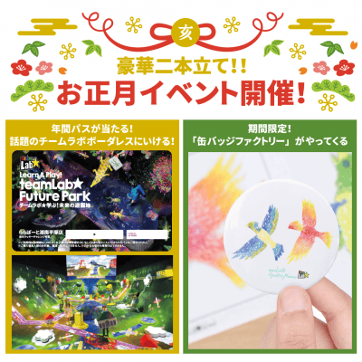 お正月限定イベント開催!2019年最初に、2つのイベントをご用意いたしました!まず1つ目は・・・「年間パスが当たる!話題のチームラボボーダレスにいける!新年ラッキーチャレンジ」!【期間】1月1日~1月...