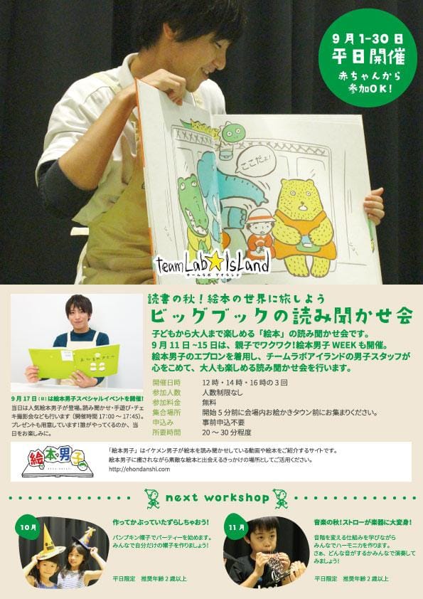 先日のワークショップのご案内でも告知をしましたが、今月9月17日17時~「チームラボアイランド -学ぶ !未来の遊園地- ららぽーと湘南平塚店」にて絵本男子スペシャルイベント開催されます!「絵本男子」...