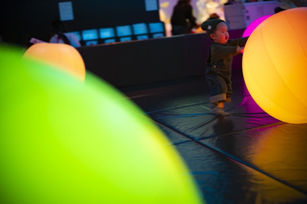 - 「光のボールでオーケストラ」作品で使用するボールに乗る、蹴る、投げる等