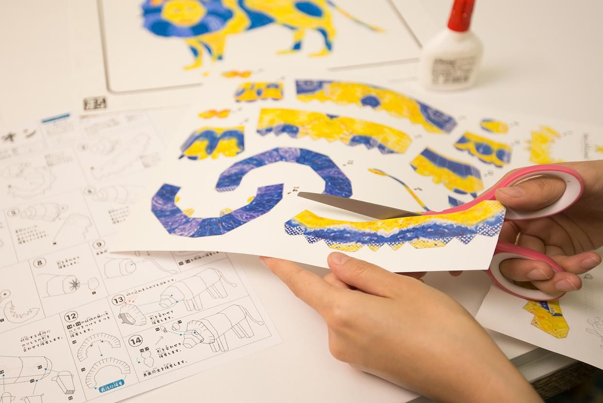 The animals drawn in crayon on paper can be turned into papercraft plans. Assemble the plan to create your own 3-D animal in a papercraft world.