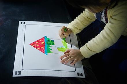 在有著城鎮組成物(車子、大樓等)輪廓的紙張上塗上顏色。2
